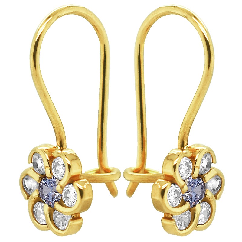Delikatne złote kolczyki , bogato zdobione motywem kwiatuszka z jasno niebieską cyrkonią dekorowane białymi cyrkoniami z zapięciem typu bigiel. Wspaniały kształt imitujący rozkwitający piekny kwiatuszek dodaje im uroku. Artystyczne dzieło posiadające klasę i niezwykłą energię. Wyraźny i oryginalny element naszej stylizacji.