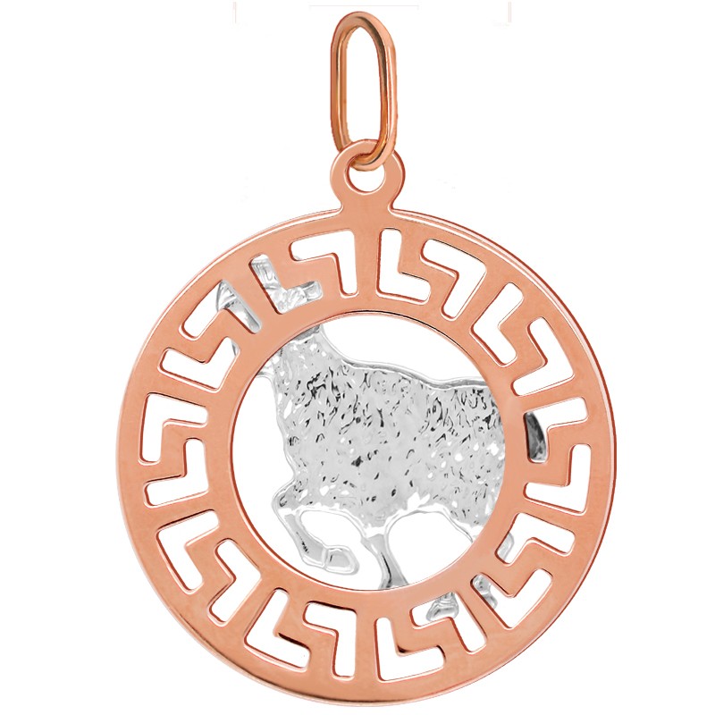 Wyobrażenie znaku zodiaku Wodnik wykonane z białego złota, natomiast podstawa jaką jest okrąg motywu Greckiego wykonany jest z czerwonego złota. Przywieszka jest wypolerowana przez co pięknie lśni i prezentuje się bardzo elegancko.