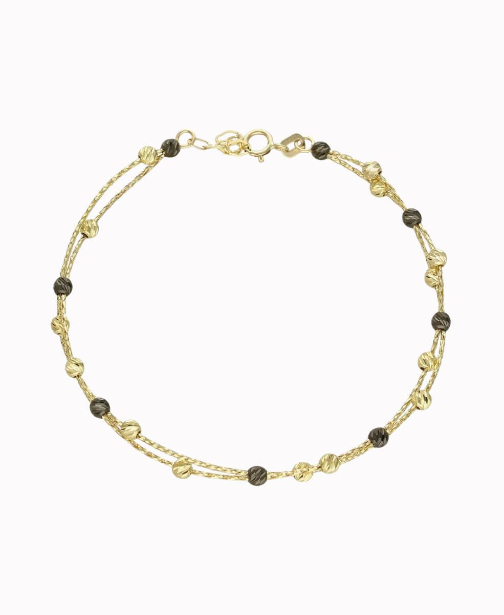Bransoletka została wykonana z najwyższą precyzją, z dbałością o każdy detal – od misternie splecionych złotych nitek po idealne proporcje drobnych, grawerowanych kuleczek. To ponadczasowy dodatek, który świetnie komponuje się zarówno z eleganckimi stylizacjami, jak i casualowym lookiem.