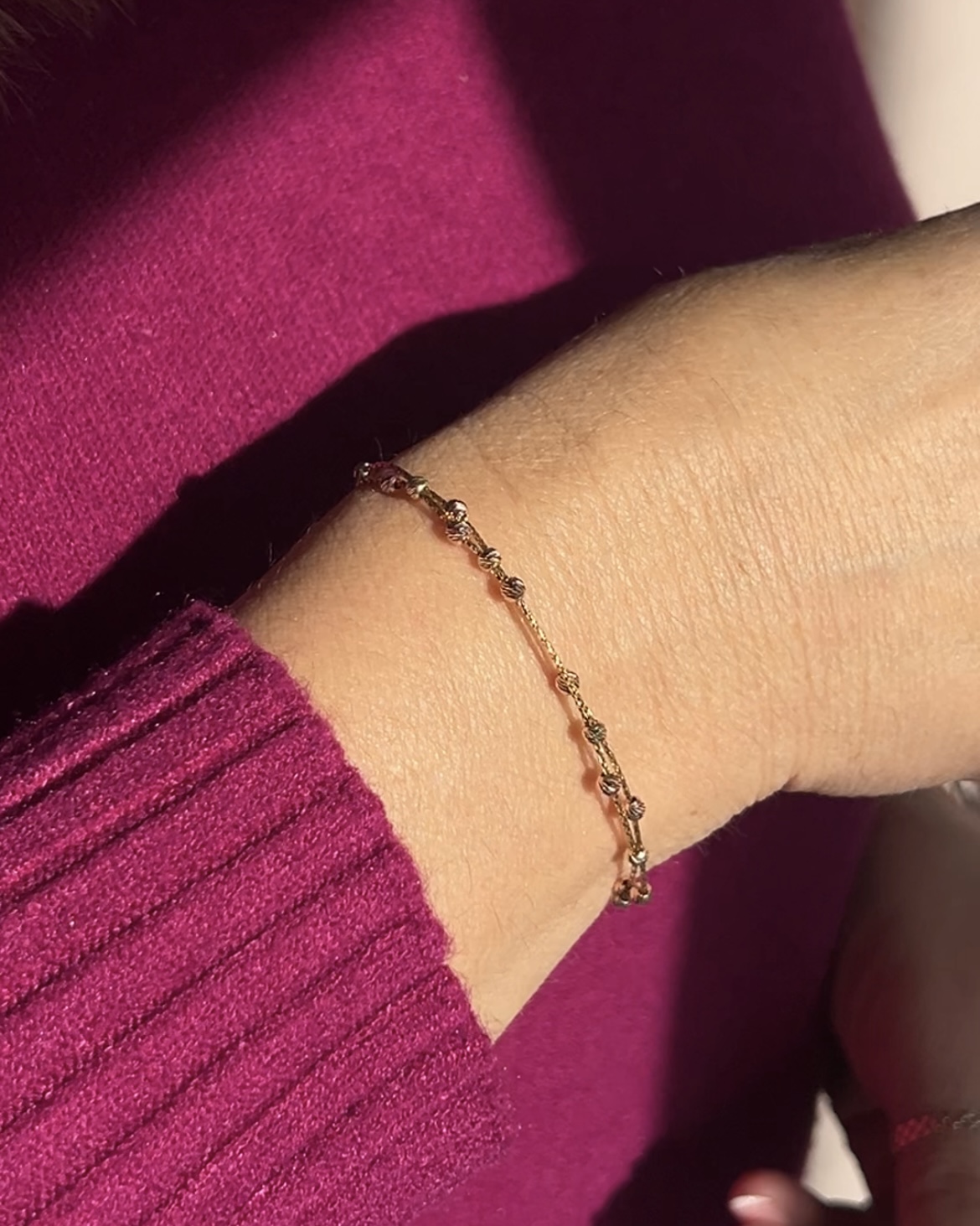 Bransoletka została wykonana z najwyższą precyzją, z dbałością o każdy detal – od misternie splecionych złotych nitek po idealne proporcje drobnych, grawerowanych kuleczek. To ponadczasowy dodatek, który świetnie komponuje się zarówno z eleganckimi stylizacjami, jak i casualowym lookiem.