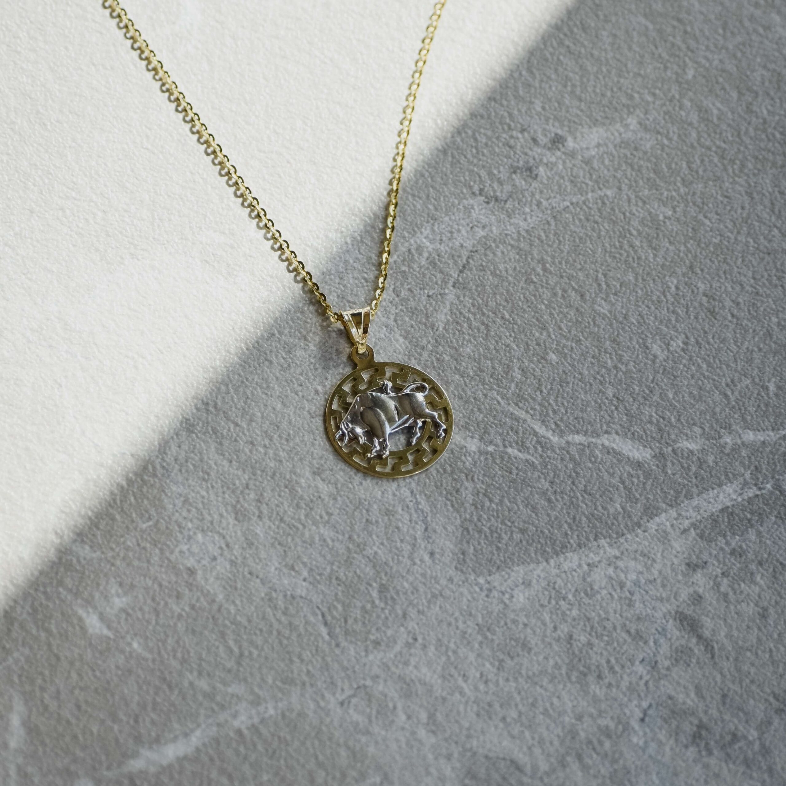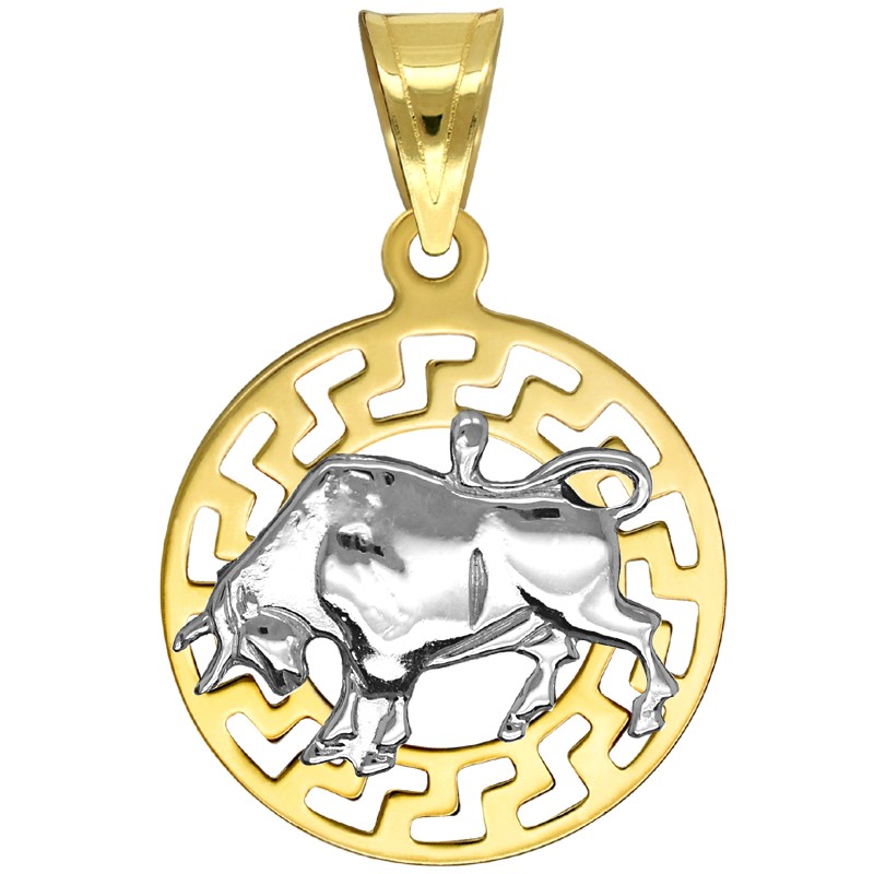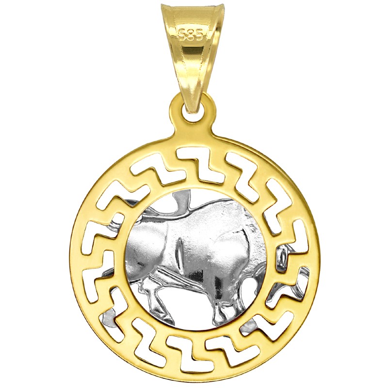Złota Przywieszka Byk znak zodiaku złota próby 585. Wyobrazenie znaku zoadiaku Byk wykonane z białego złota, natomiast podstawa jaką jest okrąg motywu Greckiego wykonany jest z żółtego złota. Przywieszka jest wypolerowana przez co pięknie lśni i prezentuje sie bardzo elegancko.