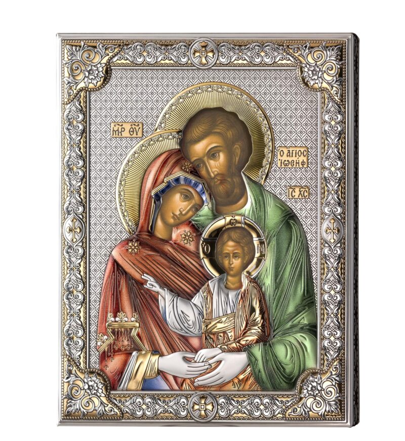 Prezentujemy wyjątkowy obrazek srebrny, idealny jako symboliczny prezent na Chrzest Święty, wyrażający głęboką duchowość. Obrazek przedstawia Matkę Bożą, Św. Józefa i Pana Jezusa jako dzieciątko. Połączenie matowej powierzchni z połyskującymi postaciami daje efekt niezwykle eleganckiego obrazu, który z powodzeniem stanie się pamiątką przypominającą o ważnym rodzinnym wydarzeniu. Stanowi doskonały prezent z okazji Ślubu, Chrztu świętego lub urodzin.