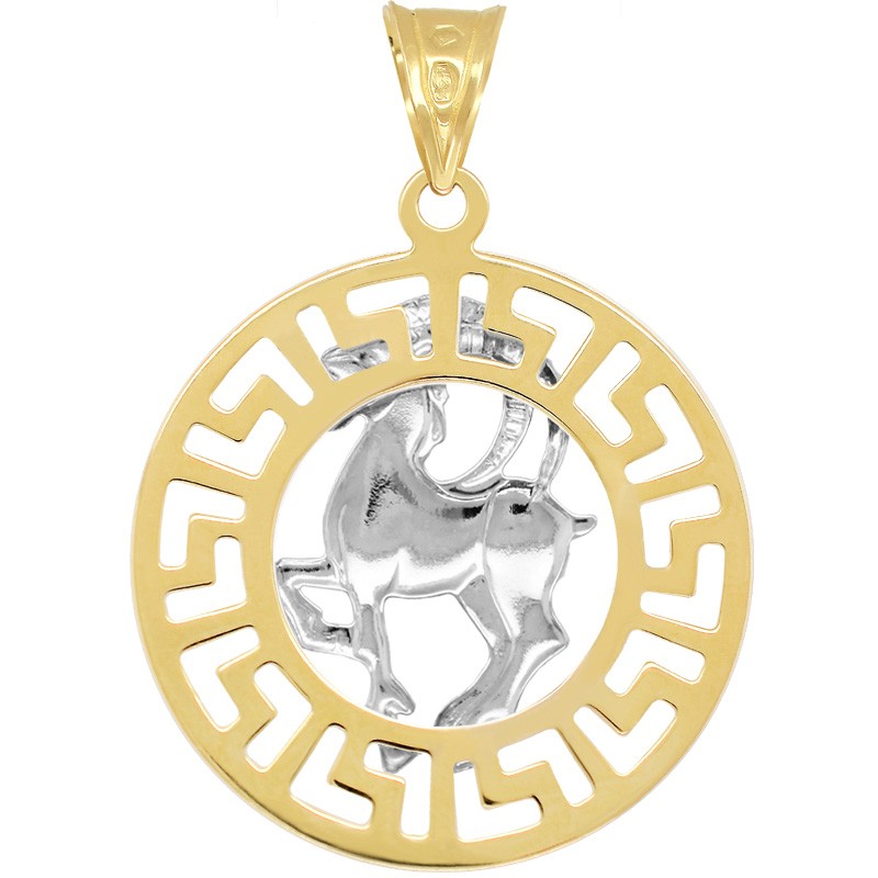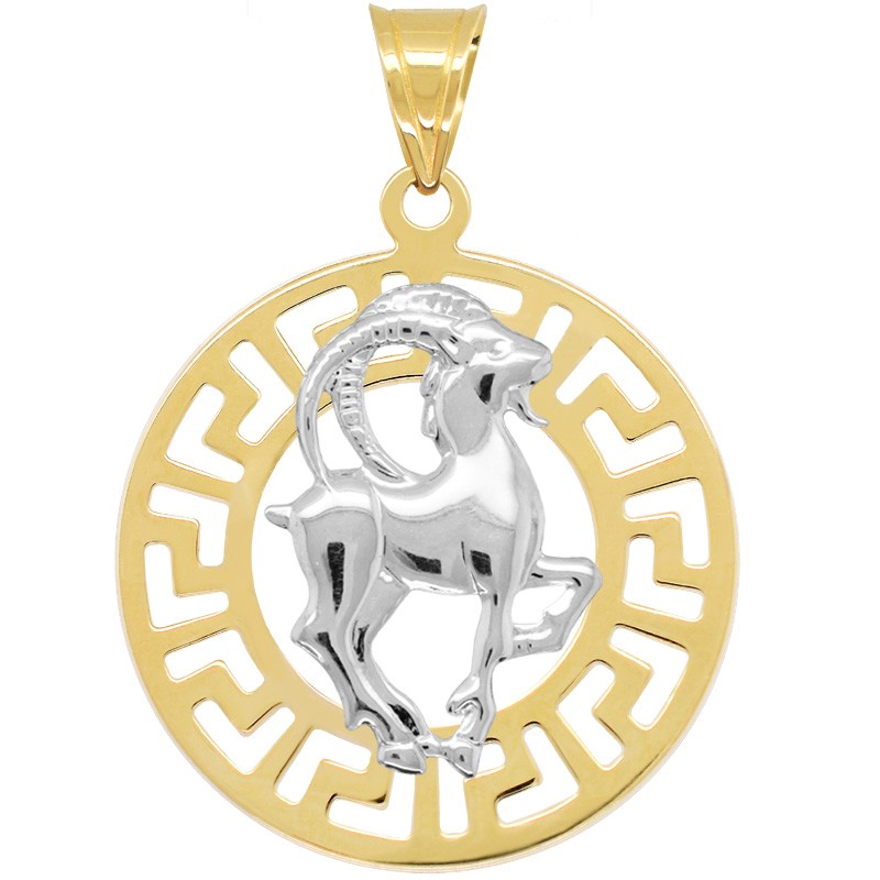 Złota Przywieszka Koziorożec znak zodiaku złota próby 585. Wyobrażenie znaku zodiaku Wodnik wykonane z białego złota, natomiast podstawa jaką jest okrąg motywu Greckiego wykonany jest z żółtego złota. Przywieszka jest wypolerowana przez co pięknie lśni i prezentuje się bardzo elegancko.