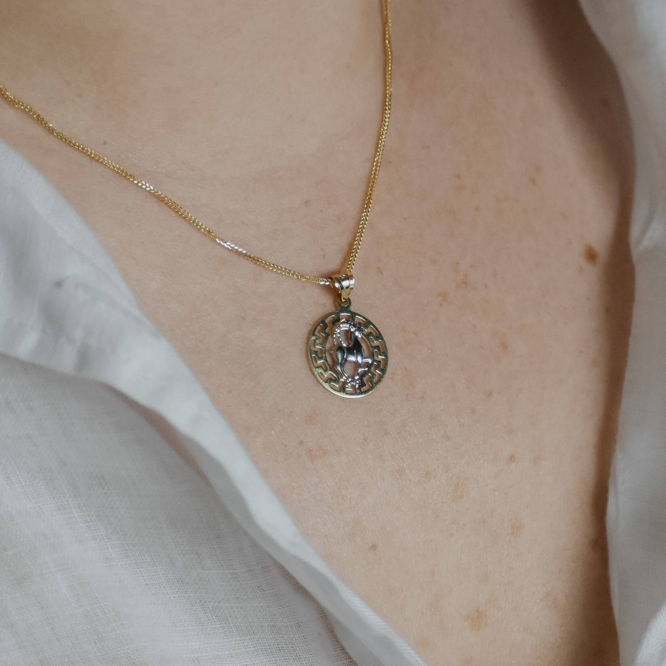 Złota zawieszka ze znakiem zodiaku w kolorze białego złota natomiast podstawa jaką jest okrąg motywu Greckiego wykonany jest z czerwonego złota. Zawieszka wykonana jest z wysokiej jakości złota próby 585, to połączenie piękna i wyjątkowości. Zawieszka emanuje elegancją, prezentuje wyjątkowy design, który wyróżnia się na tle innych biżuterii. To akcent, który przyciąga spojrzenia. Dodatkowo motyw znaku zodiaku to trend tego roku, który może podkreślać nie tylko Twoją stylizację, a również Twoją osobowość.