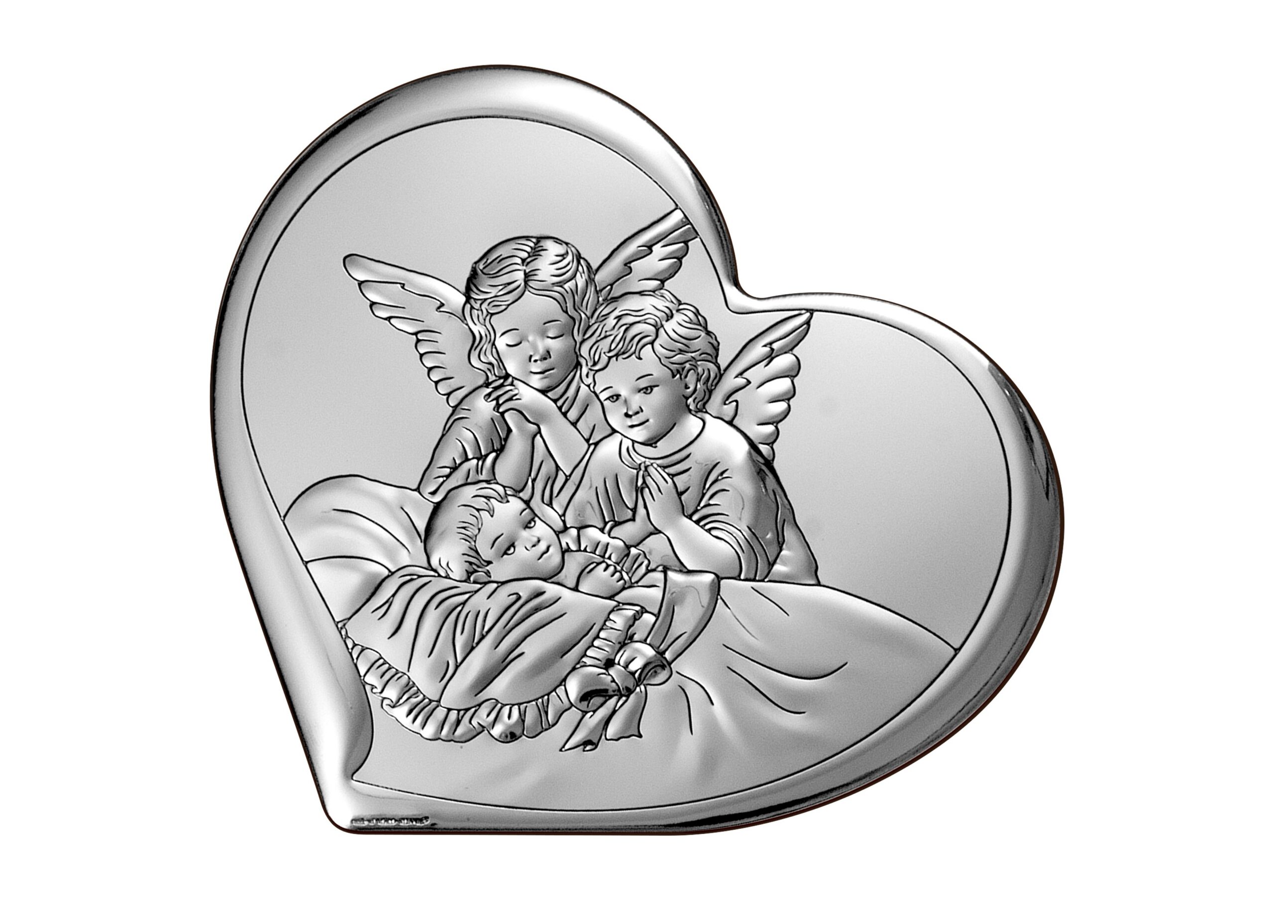 Prezentujemy wyjątkowy obrazek srebrny, idealny jako symboliczny prezent na Chrzest Święty, wyrażający głęboką duchowość. Obraz przedstawia dwóch aniołów stróżów, którzy czuwają nad snem dziecka. Połączenie matowej powierzchni z połyskującymi postaciami daje efekt niezwykle eleganckiego obrazu, który z powodzeniem stanie się pamiątką przypominającą o przyjęciu sakramentu Chrztu Świętego.
