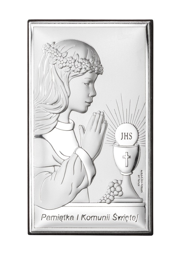 Obrazek przedstawia wizerunek dziewczynki przystępującej do Pierwszej Komunii Świętej. Połączenie matowej powierzchni z połyskującą postacią daje efekt niezwykle eleganckiego obrazu, który z powodzeniem stanie się pamiątką przypominającą o przyjęciu sakramentu I Komunii Św. Obrazek jest przystosowany do postawienia na półce lub do powieszenia na ścianie.