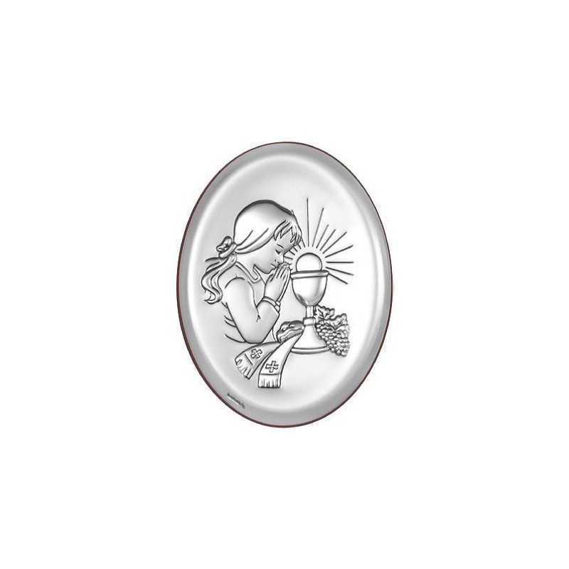 Obrazek przedstawia wizerunek dziewczynki przystępującej do Pierwszej Komunii Świętej. Połączenie matowej powierzchni z połyskującą postacią daje efekt niezwykle eleganckiego obrazu, który z powodzeniem stanie się pamiątką przypominającą o przyjęciu sakramentu I Komunii Św. Obrazek jest przystosowany do postawienia na półce lub do powieszenia na ścianie.