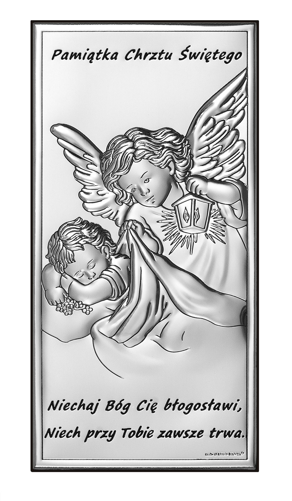 Prezentujemy wyjątkowy obrazek srebrny, idealny jako symboliczny prezent na Chrzest Święty, wyrażający głęboką duchowość. Obraz przedstawia anioła stróża, który czuwa nad snem dziecka. Połączenie matowej powierzchni z połyskującymi postaciami daje efekt niezwykle eleganckiego obrazu, który z powodzeniem stanie się pamiątką przypominającą o przyjęciu sakramentu Chrztu Świętego.