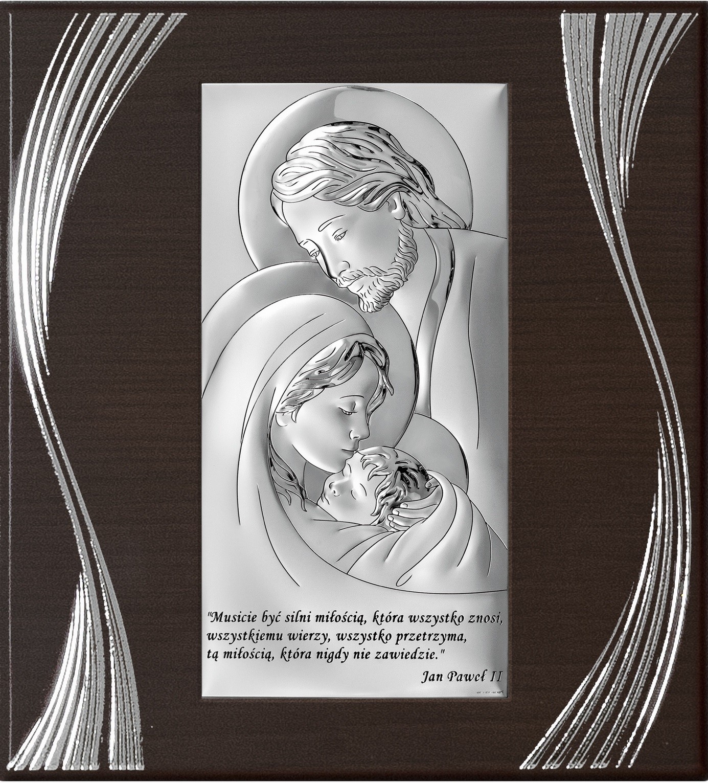 Prezentujemy wyjątkowy obrazek srebrny, idealny jako symboliczny prezent na Chrzest Święty, wyrażający głęboką duchowość. Obrazek przedstawia Matkę Bożą, Św. Józefa i Pana Jezusa jako dzieciątko. Połączenie matowej powierzchni z połyskującymi postaciami daje efekt niezwykle eleganckiego obrazu, który z powodzeniem stanie się pamiątką przypominającą o ważnym rodzinnym wydarzeniu. Stanowi doskonały prezent z okazji Ślubu, Chrztu świętego lub urodzin.