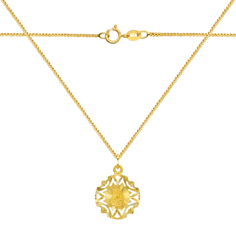 Prezentujemy wyjątkowy złoty łańcuszek z medalikiem z wizerunkiem Matki Boskiej Częstochowskiej z Dzieciątkiem Jezus na awersie, stanowiący zarówno piękną pamiątkę chrztu i komunii, jak również silny symbol wiary. Pamiątka Chrztu Świętego lub Komunii Świętej. To doskonały prezent na każdą okazję na przykład: pamiątkę Chrztu św., Pierwszej Komunii Św. Bierzmowania, jubileuszu, czy też rocznicy ślubu.