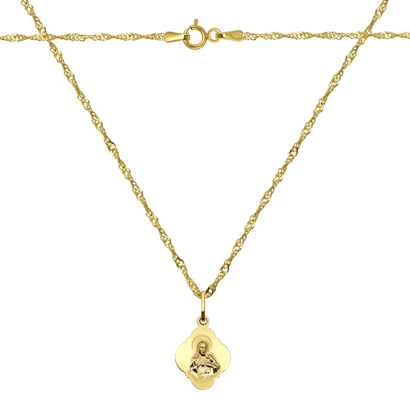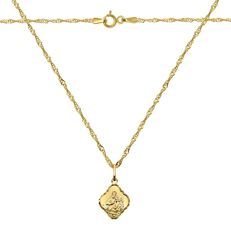 Prezentujemy wyjątkowy złoty łańcuszek i medalik Szkaplerz z przodu ukazuje wizerunek Matki Bożej Szkaplerznej, a na odwrocie Serce Pana Jezusa. Stanowi zarówno piękną pamiątkę chrztu i komunii, jak również silny symbol wiary. Pamiątka Chrztu Świętego lub Komunii Świętej. To doskonały prezent na każdą okazję na przykład: pamiątkę Chrztu św., Pierwszej Komunii Św. Bierzmowania, jubileuszu, czy też rocznicy ślubu.
