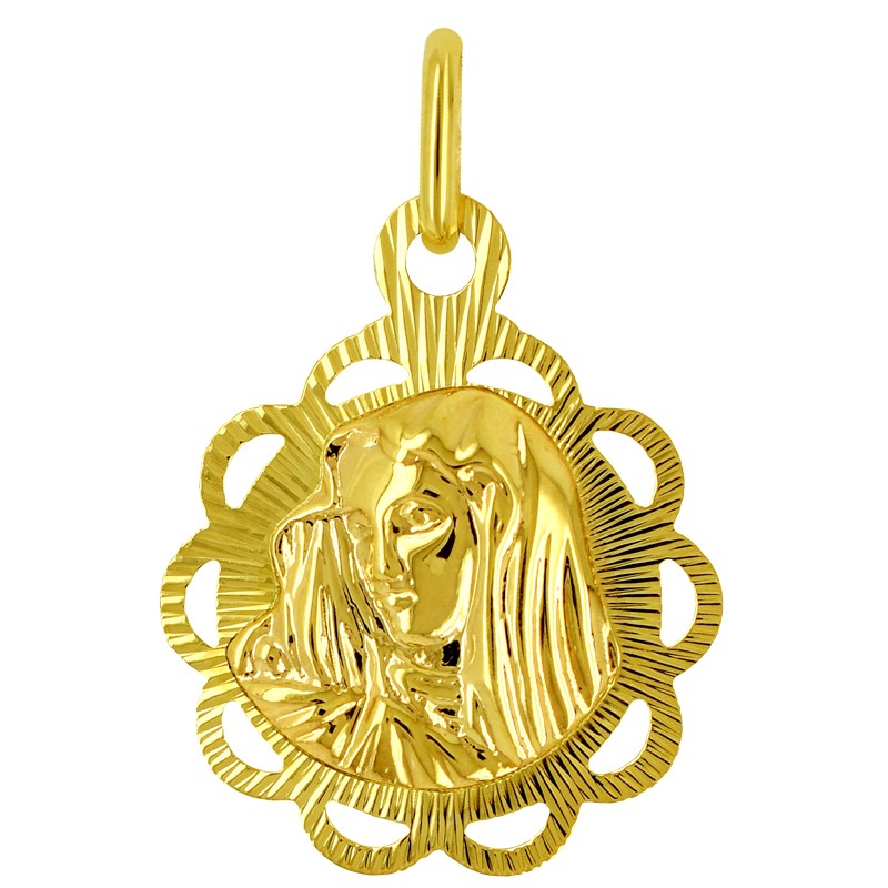 Złoty medalik – z wizerunkiem Matki Bożej na awersie, rewers stanowi wypolerowany na gładko owalny kształt doskonałe miejsce na ewentualną dedykcję lub inny grawerunek.