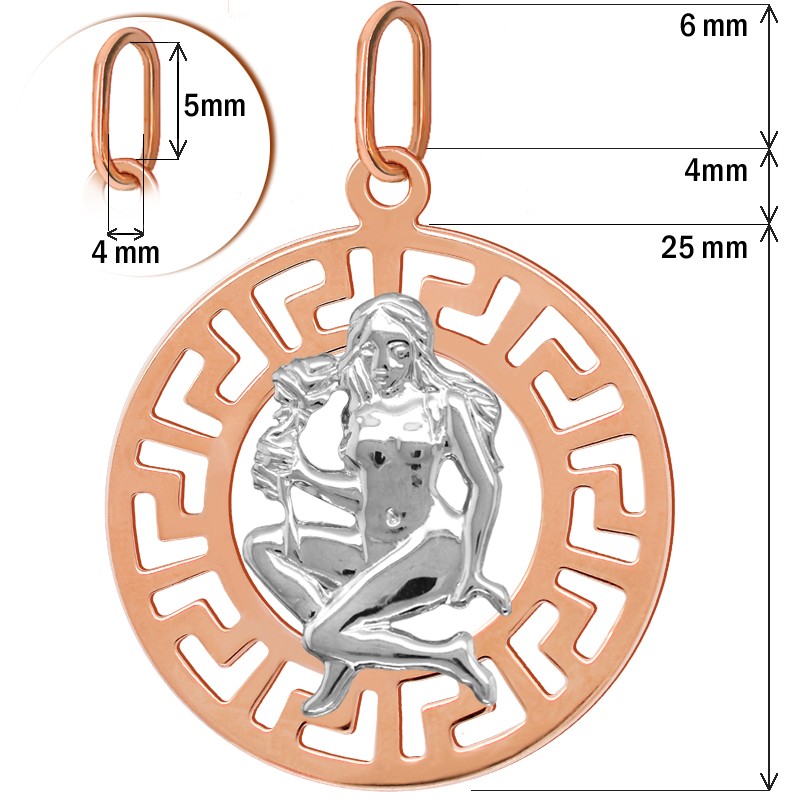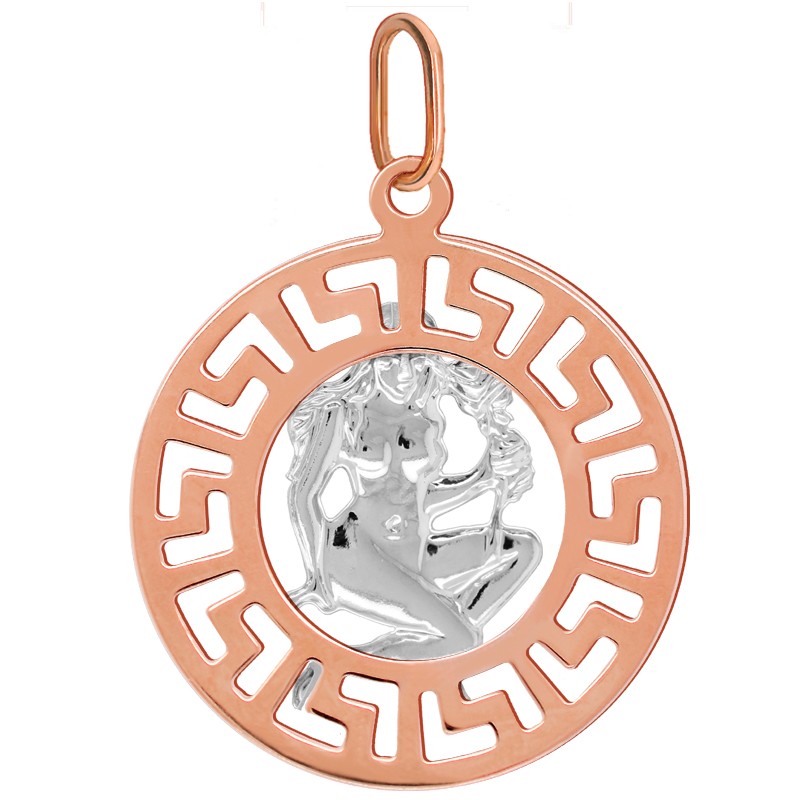 Wyobrażenie znaku zodiaku Wodnik wykonane z białego złota, natomiast podstawa jaką jest okrąg motywu Greckiego wykonany jest z czerwonego złota. Przywieszka jest wypolerowana przez co pięknie lśni i prezentuje się bardzo elegancko.