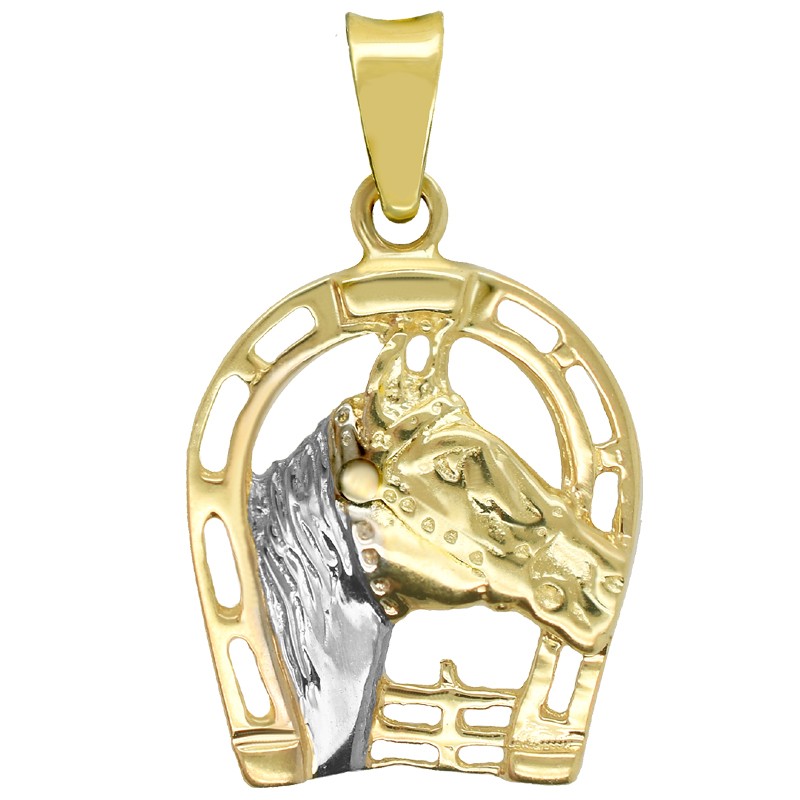 Przywieszka Złota Podkowa z głową konia z białym złotem wykonane z białego rodowanego złota i żółtego złota przez co pięknie lśni i połyskuje. Prezentuje się bardzo bogato i oryginalnie. Taka zawieszka na dekolcie będzie przykuwała uwagę swoją ciekawą i niepowtarzalną formą. Udekorowana podkową głowa konia może być prezentem dla ukochanej lub nieprzemijającą pamiątką.