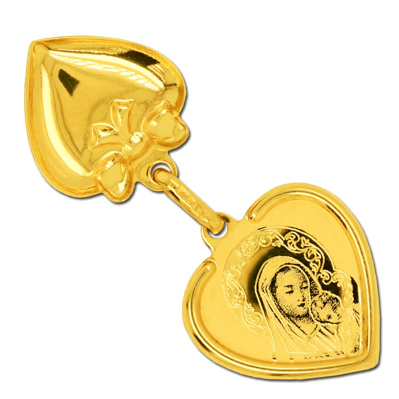 Z wizerunkiem Matki Boskiej z Dzieciątkiem Jezus ukryty w przepięknie wypolerowanym ozdobnym sercu. Złoty Medalik to nie tylko biżuteria, ale również mistyczny symbol wiary. Jego wzruszający wizerunek ma duchowe znaczenie dla wielu osób, stanowiąc wyjątkowy prezent dla tych, którzy pragną wyrazić swoją głęboką wiarę i duchową więź. Złoty medalik stanowi doskonały prezent na każdą okazję, pamiątkę Chrztu św., Pierwszej Komunii Św.  Bierzmowania, jubileuszu czy też rocznicy ślubu.