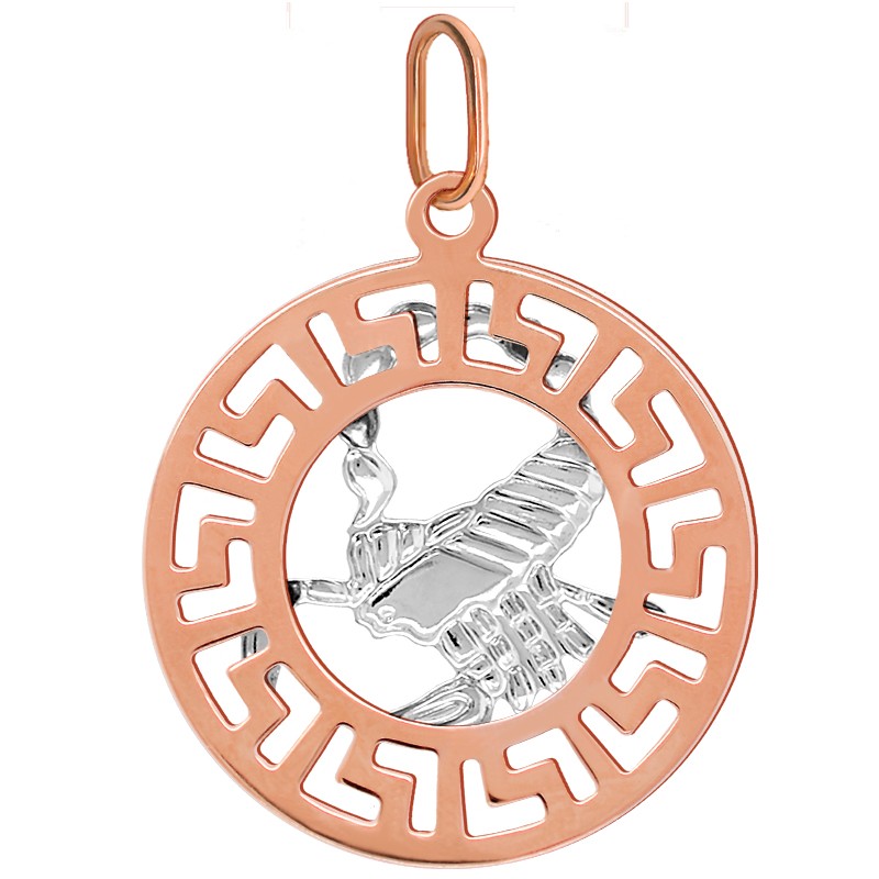 Wyobrażenie znaku zodiaku Wodnik wykonane z białego złota, natomiast podstawa jaką jest okrąg motywu Greckiego wykonany jest z czerwonego złota. Przywieszka jest wypolerowana przez co pięknie lśni i prezentuje się bardzo elegancko.