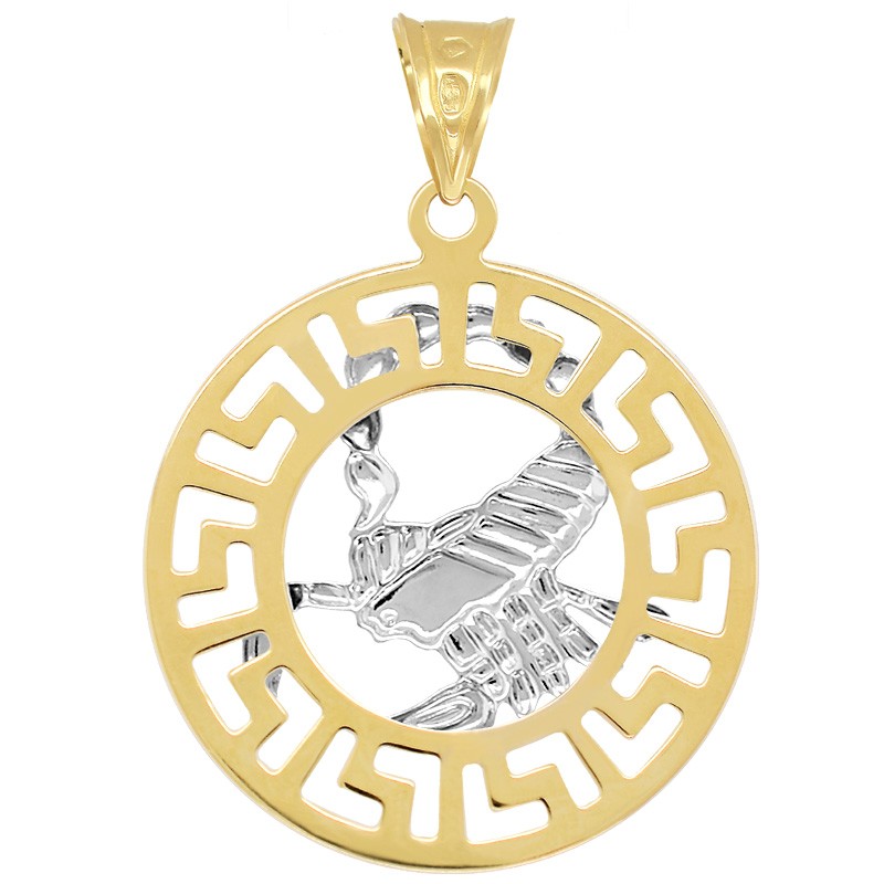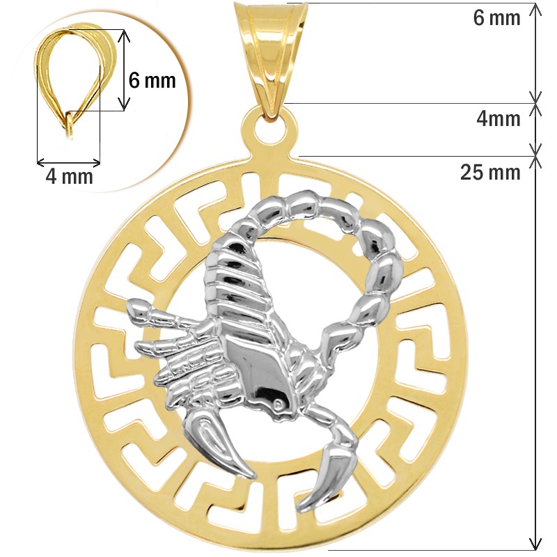 Złota Przywieszka Skorpion znak zodiaku złota próby 585. Wyobrażenie znaku zodiaku Wodnik wykonane z białego złota, natomiast podstawa jaką jest okrąg motywu Greckiego wykonany jest z żółtego złota. Przywieszka jest wypolerowana przez co pięknie lśni i prezentuje się bardzo elegancko.