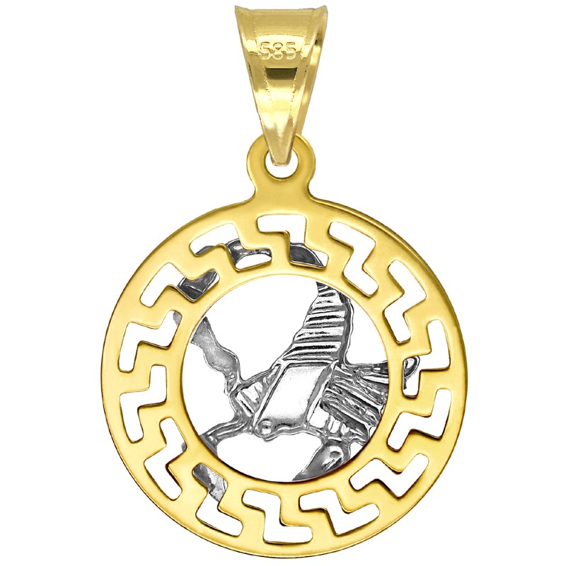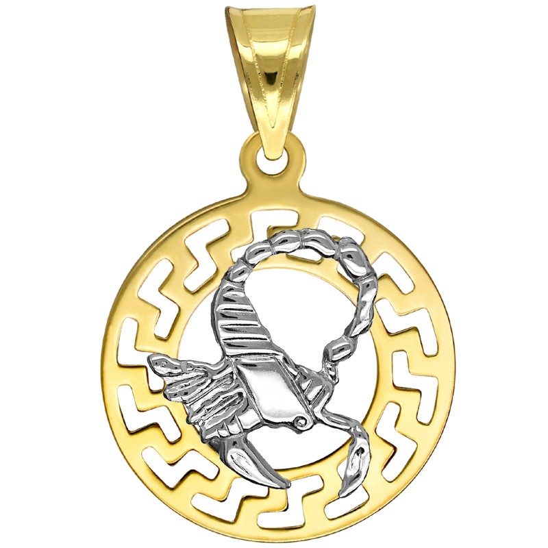 Złota Przywieszka Skorpion znak zodiaku złota próby 585. Wyobrazenie znaku zoadiaku Skorpion wykonane z białego złota, natomiast podstawa jaką jest okrąg motywu Greckiego wykonany jest z żółtego złota. Przywieszka jest wypolerowana przez co pięknie lśni i prezentuje sie bardzo elegancko.