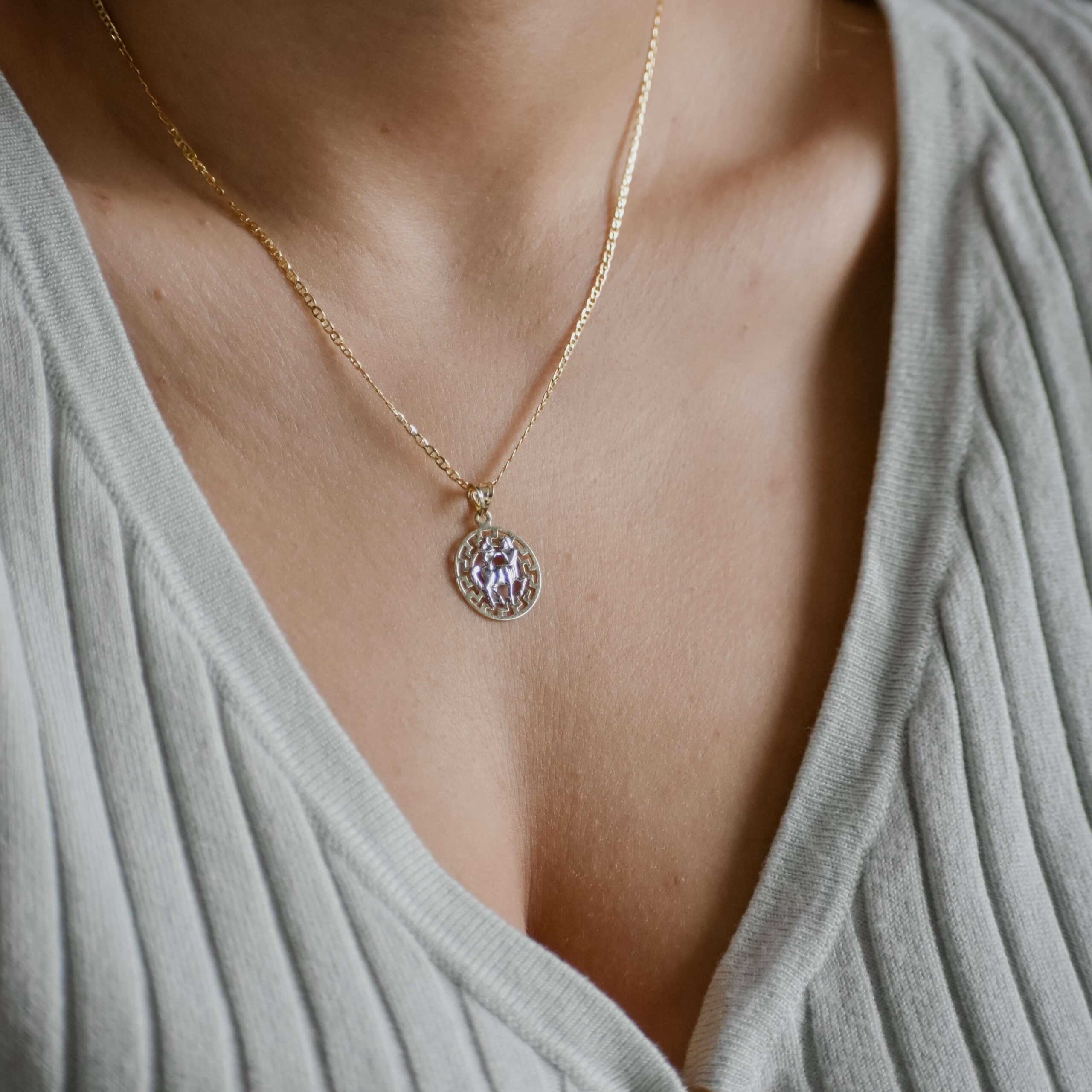 Złota zawieszka ze znakiem zodiaku w kolorze białego złota natomiast podstawa jaką jest okrąg motywu Greckiego wykonany jest z czerwonego złota. Zawieszka wykonana jest z wysokiej jakości złota próby 585, to połączenie piękna i wyjątkowości. Zawieszka emanuje elegancją, prezentuje wyjątkowy design, który wyróżnia się na tle innych biżuterii. To akcent, który przyciąga spojrzenia. Dodatkowo motyw znaku zodiaku to trend tego roku, który może podkreślać nie tylko Twoją stylizację, a również Twoją osobowość.