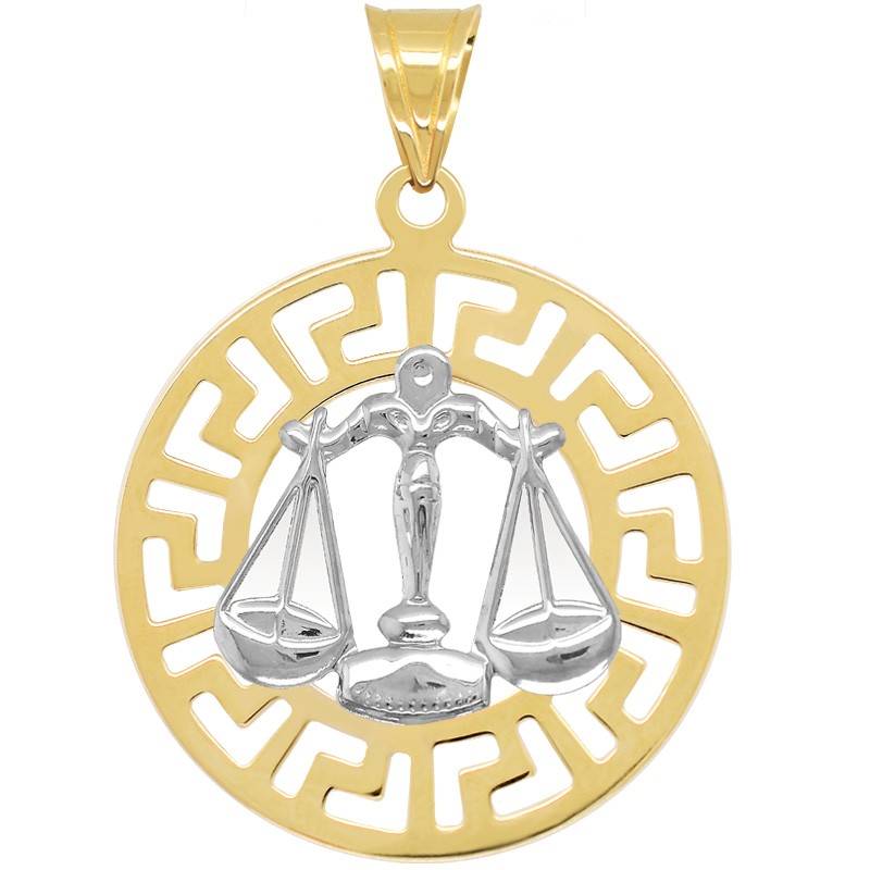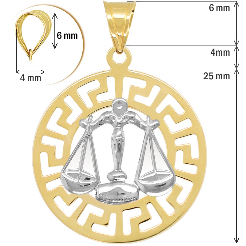 Złota Przywieszka Waga znak zodiaku złota próby 585. Wyobrażenie znaku zodiaku Wodnik wykonane z białego złota, natomiast podstawa jaką jest okrąg motywu Greckiego wykonany jest z żółtego złota. Przywieszka jest wypolerowana przez co pięknie lśni i prezentuje się bardzo elegancko.