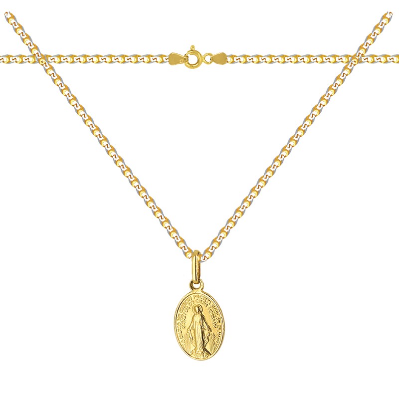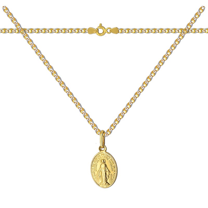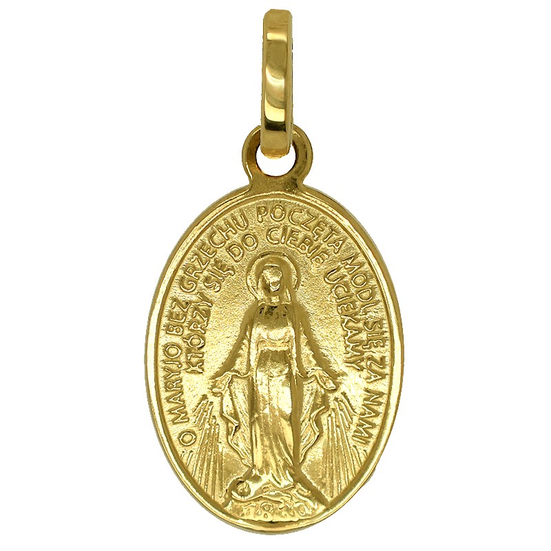 Prezentujemy wyjątkowy złoty łańcuszek z medalikiem Matki Bożej, stanowiący zarówno piękną pamiątkę chrztu i komunii, jak również silny symbol wiary. Pamiątka Chrztu Św. lub Komunii Św. złoty łańcuszek i Polski Cudowny Medalik, MBNP S – znany też jako Medalik Niepokalanego Poczęcia pięknie ozdobiony może stanowić piękną ozdobę religijną. Doskonały prezent na każdą okazję na przykład na pamiątkę Chrztu św., Pierwszej Komunii Św. Bierzmowania, jubileuszu, czy też rocznicy ślubu.