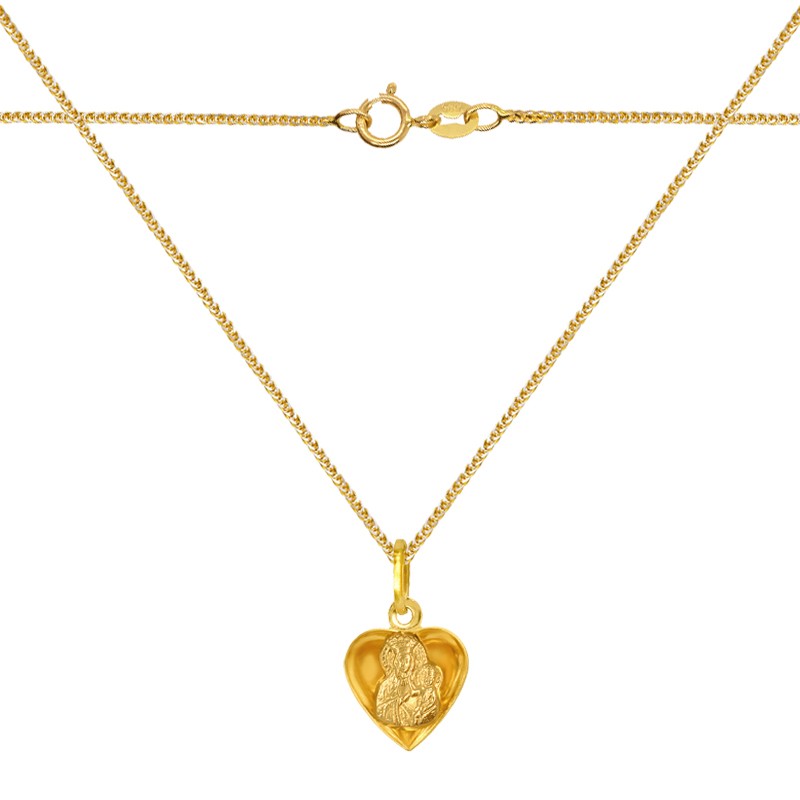 Prezentujemy wyjątkowy złoty łańcuszek z medalikiem Matki Bożej, stanowiący zarówno piękną pamiątkę chrztu i komunii, jak również silny symbol wiary. Pamiątka Chrztu Św. lub Komunii Św. Medalik jest wykonany z najwyższą starannością ze złota wysokiej próby 585 w delikatnym żółtym kolorze. Wnętrze serduszka jest starannie wypolerowane przez co pięknie lśni i odbija światło. Pasuje do większości łańcuszków z naszej oferty. Doskonały prezent na każdą okazję na przykład: pamiątkę Chrztu św., Pierwszej Komunii Św. Bierzmowania, jubileuszu, czy też rocznicy ślubu.