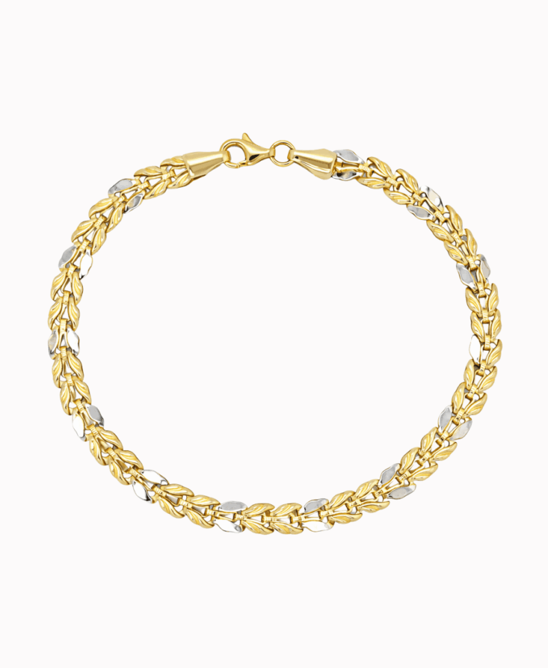 Szukasz dodatku, który wygląda luksusowo, a jednocześnie pasuje do wszystkiego? Złota bransoletki listki wykonana z dwóch kolorów złota (białe i żółte) przyciąga wzrok dzięki dekoracyjnemu splotowi przypominającemu listki, które pięknie odbijają światło. Dwukolorowe wykończenie sprawia, że łatwo zestawisz ją zarówno ze złotą biżuterią, jak i z dodatkami w kolorze białego złota – bez konieczności wybierania jednego koloru.
