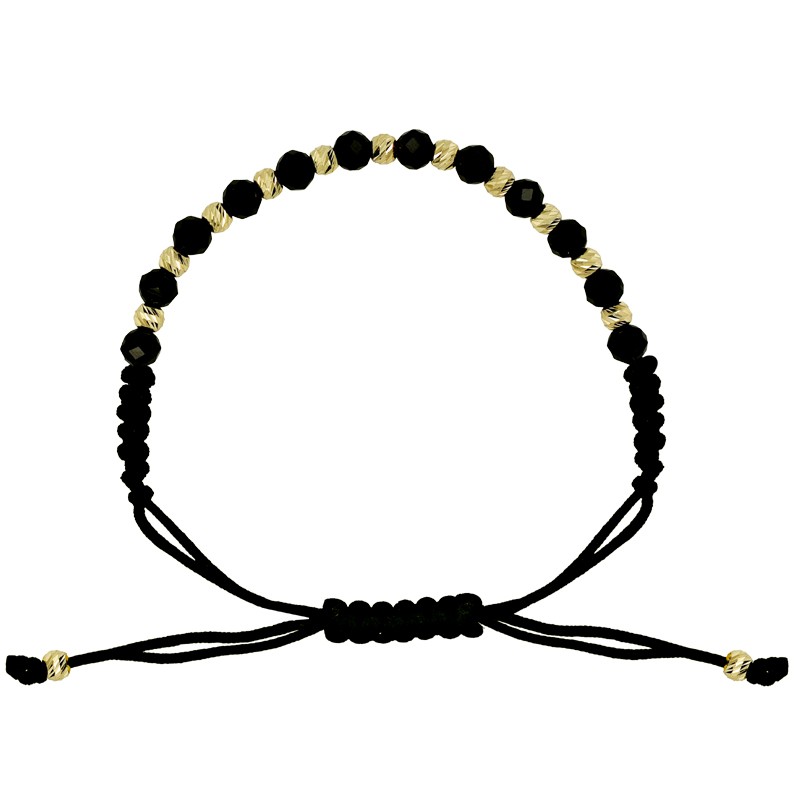 Ta wyjątkowa bransoletka łączy w sobie elegancję i magię natury. Wykonana z czanego nylonu, bransoletka jest ozdobiona diamentowanymi złotymi kuleczkami oraz kuleczkami z Turmalinu naturalnego. Turmalin to kamień któremu od III wieku p.n.e. w Chinach przypisywano wiele magicznych właściwości szczególnie jako tarcza ochronna przed działaniem negatywnych energii. Symbolizuje miłość, bogactwo, ponieważ należy do kamieni słonecznych, ma moc przyciągania przyjaźni i ułatwia porozumienie.