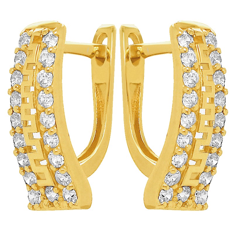 Nietuzinkowe złote kolczyki , bogato zdobione eleganckim Greckim wzorem oraz Cyrkoniami. Regularny kształt imitujący zawiłosci Greckiego labiryntu dodaje im uroku.