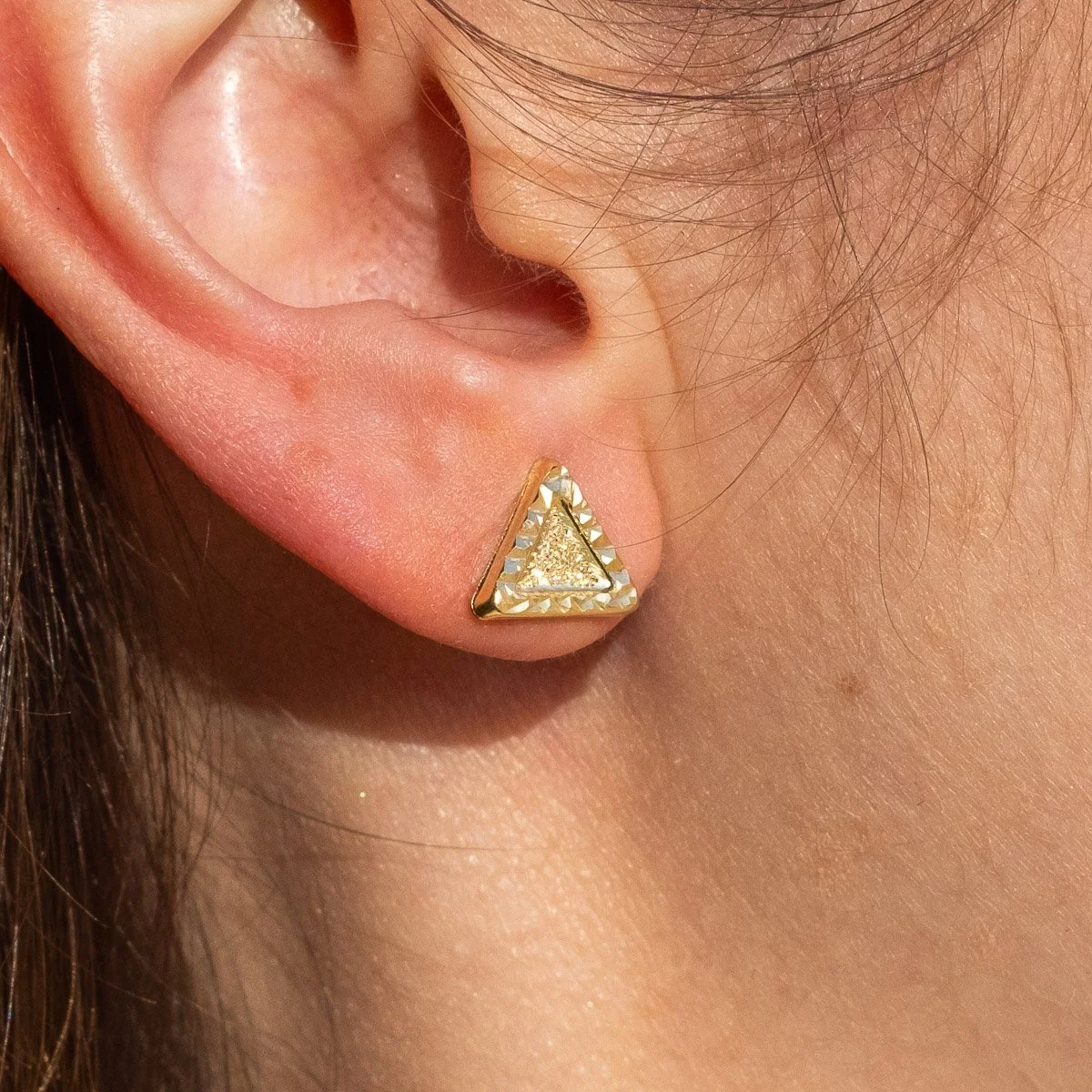 Dodaj wyjątkowego blasku swojej stylizacji dzięki eleganckim złotym kolczykom w kształcie trójkątów. Wykonane z wysokiej jakości złota próby 585, zachwycają precyzyjnym diamentowaniem i subtelnym grawerem, który pięknie odbija światło, tworząc efekt delikatnego połysku. Ich nowoczesny, geometryczny design idealnie sprawdzi się zarówno na co dzień, jak i na wyjątkowe okazje. Zapięcie typu sztyft podnosi komfort noszenia kolczyków na codzień.