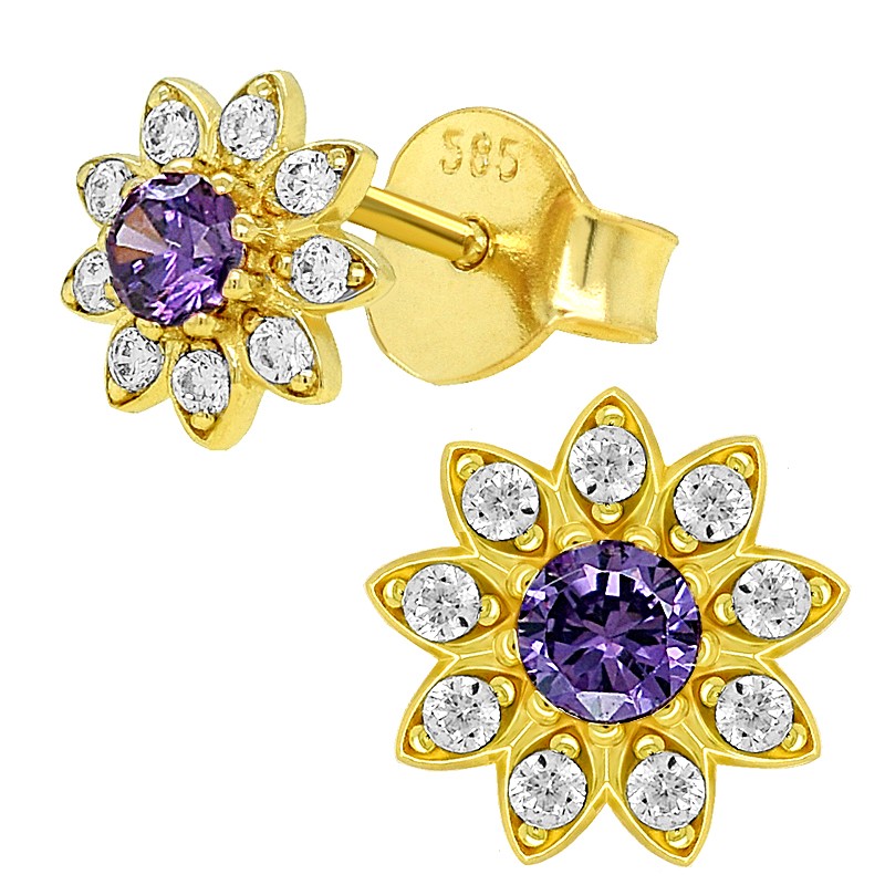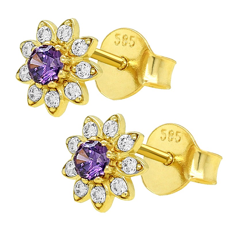 Złote kolczyki Kwiatuszki Ametyst z cyrkoniami sztyft pr. 585