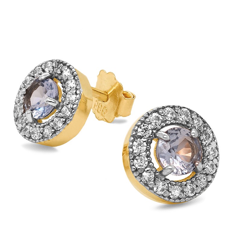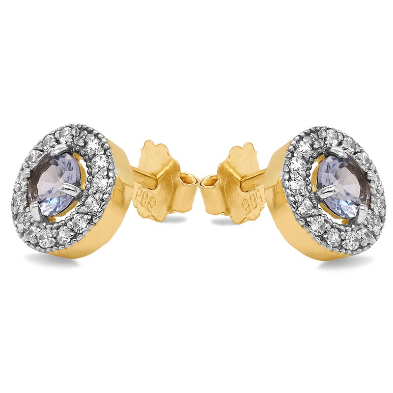 Złote kolczyki Princess z cyrkonią barwiona na kolor akwamarynu posiadają zapięcia na sztyft.