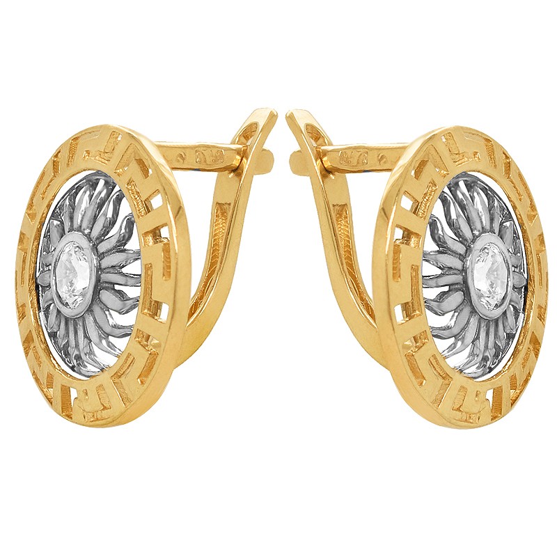 Nietuzinkowe złote kolczyki , bogato zdobione greckim wzorem i cyrkonią. Nieoczywisty i nieregularny kształt imitujący słońce dodaje im uroku. Artystyczne dzieło posiadające klasę i niezwykłą energię. Wyraźny i oryginalny element naszej stylizacji.