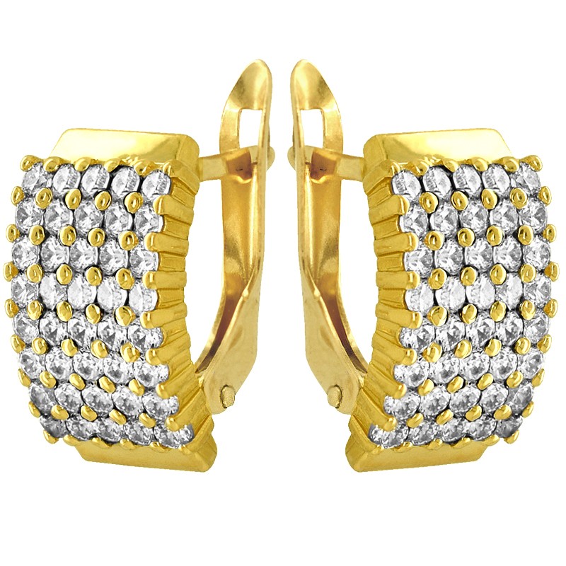 Nietuzinkowe złote wielokamieniowe pięciorzędowe kolczyki, bogato zdobione białymi cyrkoniami. Prosty i regularny kształt, to artystyczne dzieło posiadające klasę i niezwykłą energię. Wyraźny i oryginalny element naszej stylizacji.