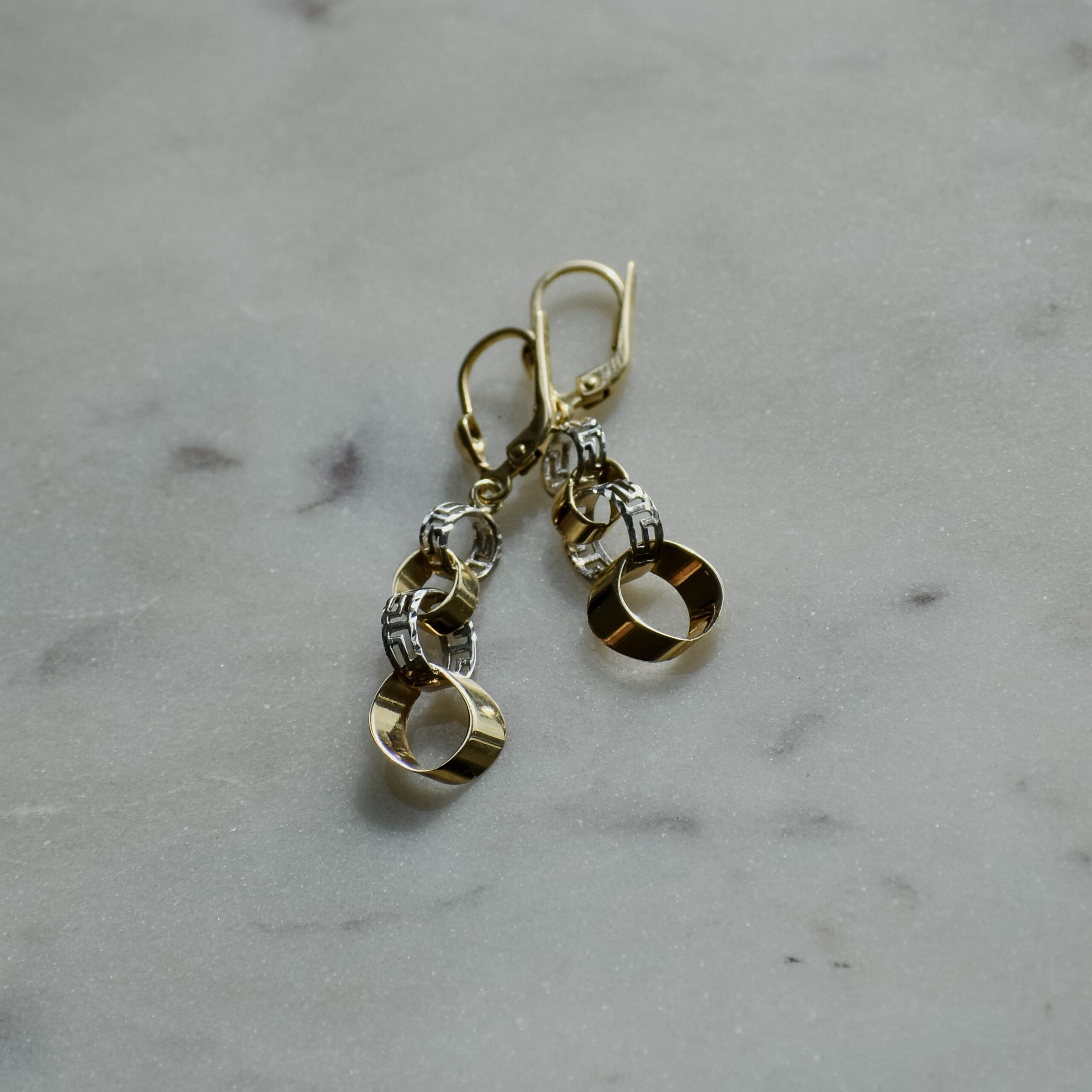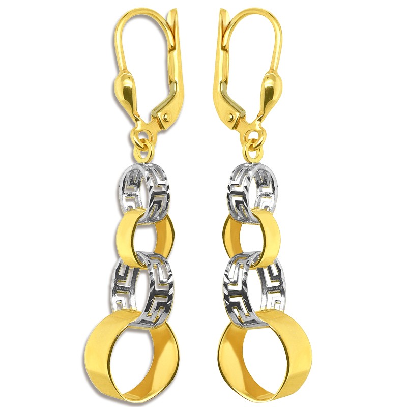 Prezentujemy Złote Kolczyki Wiszące, ozdobione charakterystycznym greckim wzorem wykonane z białego i żółtego złota posiadają zapięcia typu angielskiego. To połączenie tradycji i elegancji w biżuterii. Wzór inspirowany grecką sztuką to nie tylko ozdoba, ale także symbol piękna, harmonii i kultury. Dla miłośniczek estetyki greckiej, te kolczyki stanowią wyjątkowy akcent, który podkreśla ich styl. Złote Kolczyki Wiszące z Greckim Wzorem to biżuteria, która niesie ze sobą symbolikę greckiej kultury i estetyki. Wykonane z białego złota próby 585, to połączenie tradycji z nowoczesnością, które z pewnością zachwyci miłośniczki eleganckich dodatków.