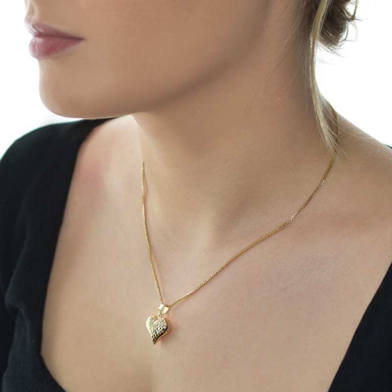 Zawieszka Złote Serce Grawerowane – piękna ozdoba szyi. Wisiorek wykonany ze złota próby 585. Pięknie prezentuje się na szyi z dużym dekoltem. Taki rodzaj złotej przywieszki przykuwa uwagę swoja niepowtarzalnym grawerem. Pięknie lśni. W wielu kulturach serce symbolizuje namiętność i silne uczucia. Wisiorek złote grawerowane serce to idealny prezent dla ukochanej.