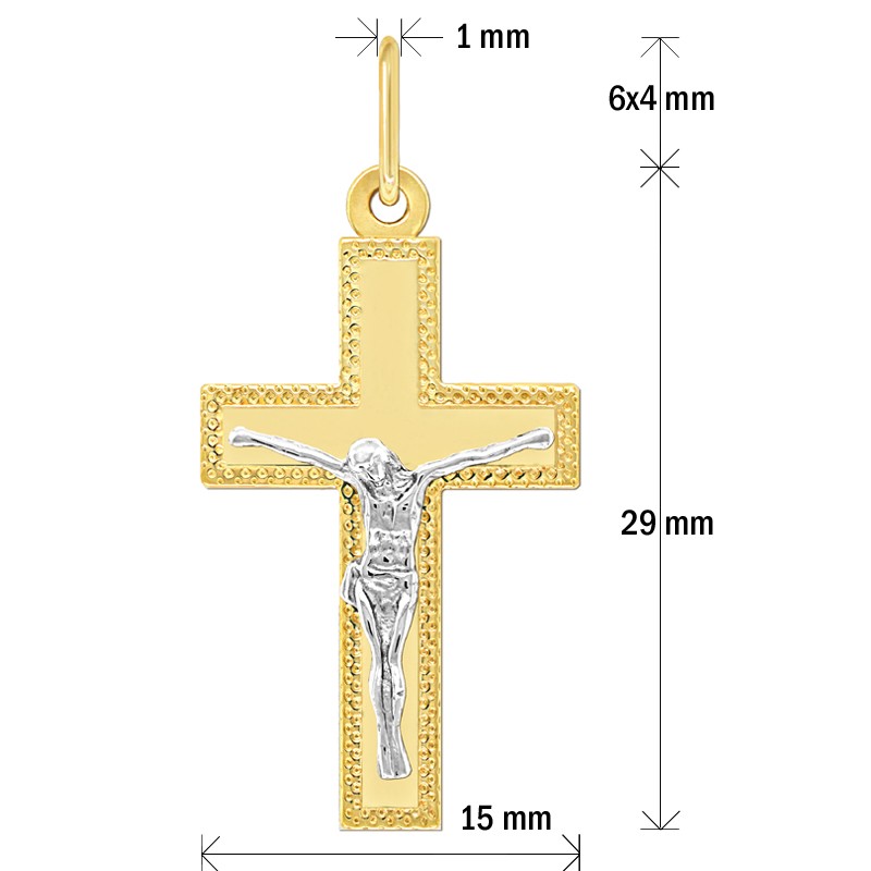 Krzyżyk jest wykonany z najwyższą starannością z żółtego i białego złota wysokiej próby 585 = 14 karatowe złoto. Zawieszka w kształcie krzyżyka jest starannie wypolerowana przez co pięknie lśni i odbija światło. Pasuje do większości łańcuszków z naszej oferty.