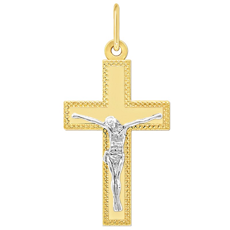 Złoty krzyżyk z białym złotem– wisiorek w kształcie krzyżyka z figurą Jezusa Chrystusa wykonaną z białego złota, stanowi przepiękną ozdobę o symbolice religijnej.