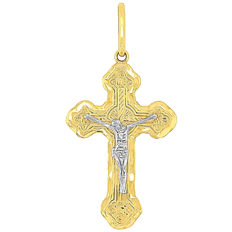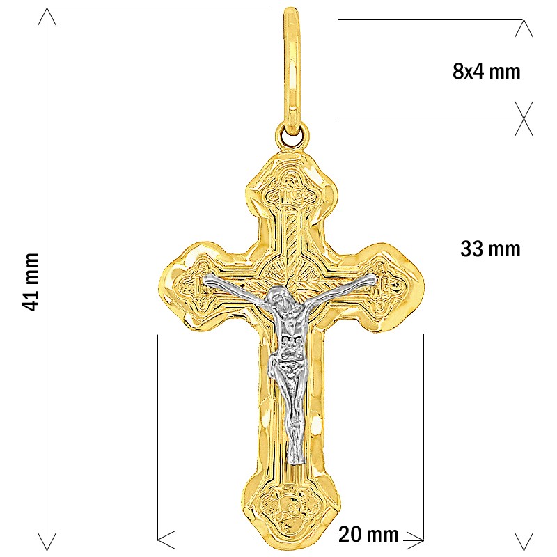 Wisiorek w kształcie krzyżyka z figurą Jezusa Chrystusa wykonaną z białego złota, stanowi przepiękną ozdobę o symbolice religijnej. Krzyżyk jest wykonany z najwyższą starannością z czerwonego i białego złota wysokiej próby 585 = 14 karatowe złoto. Zawieszka w kształcie krzyżyka jest wzbogacona elementami grawerowanymi jak również starannie wypolerowana przez co pięknie lśni i odbija światło. Pasuje do większości łańcuszków z naszej oferty. Złoty medalik stanowi doskonały prezent na każdą okazję, np. pamiątkę Chrztu Świętego.