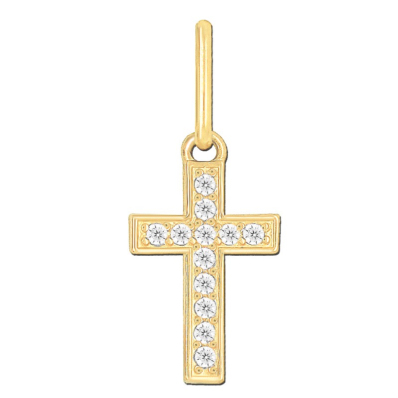 Złoty krzyżyk z cyrkoniami dwurządowy – wisiorek w kształcie krzyżyka ozdobiony cyrkoniami, stanowi przepiękną ozdobę o symbolice religijnej. Krzyżyk jest wykonany z najwyższą starannością z żółtego i białego złota wysokiej próby 585 = 14 karatowe złoto. Zawieszka w kształcie krzyżyka jest wzbogacona elementami grawerowanymi jak również starannie wypolerowana przez co pięknie lśni i odbija światło. Pasuje do większości łańcuszków z naszej oferty. Złoty medalik stanowi doskonały prezent na każdą okazję, np. pamiątkę Chrztu Świętego.
