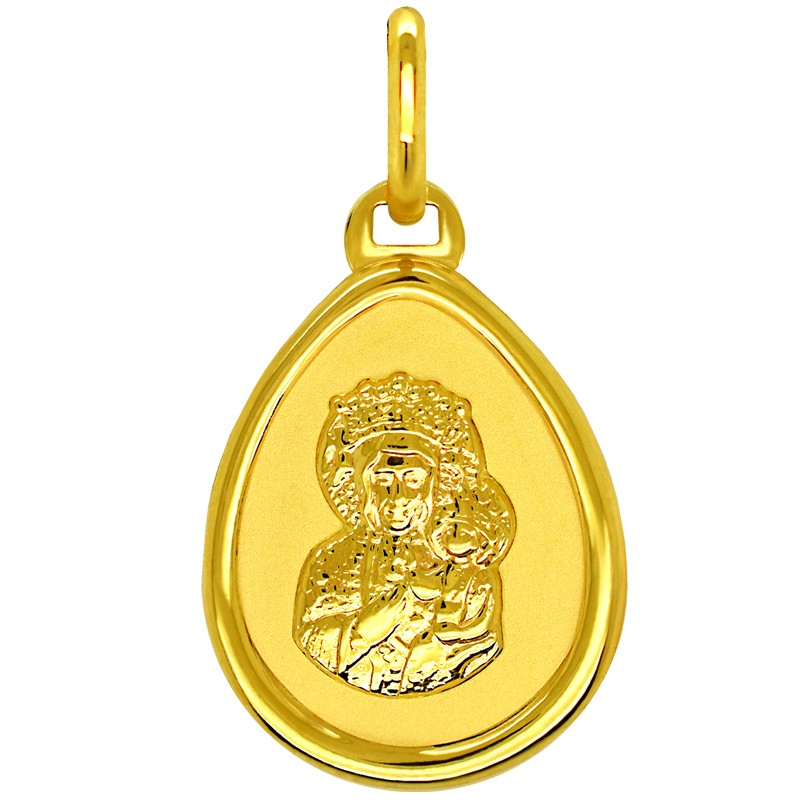 Złoty medalik – z wizerunkiem Matki Bożej Częstochowskiej na awersie, rewers stanowi wypolerowany na gładko owalny kształt doskonałe miejsce na ewentualną dedykcję lub inny grawerunek.