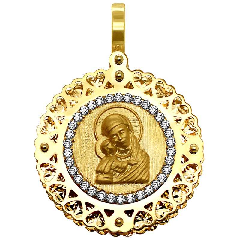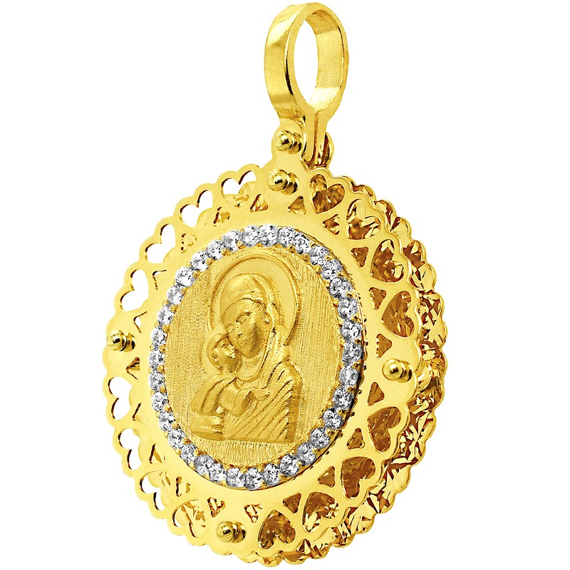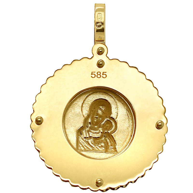 Złoty medalik przedstawiający Matkę Boskiej Opatrzności – Matkę Bożą z dzieciątkiem Jezus.