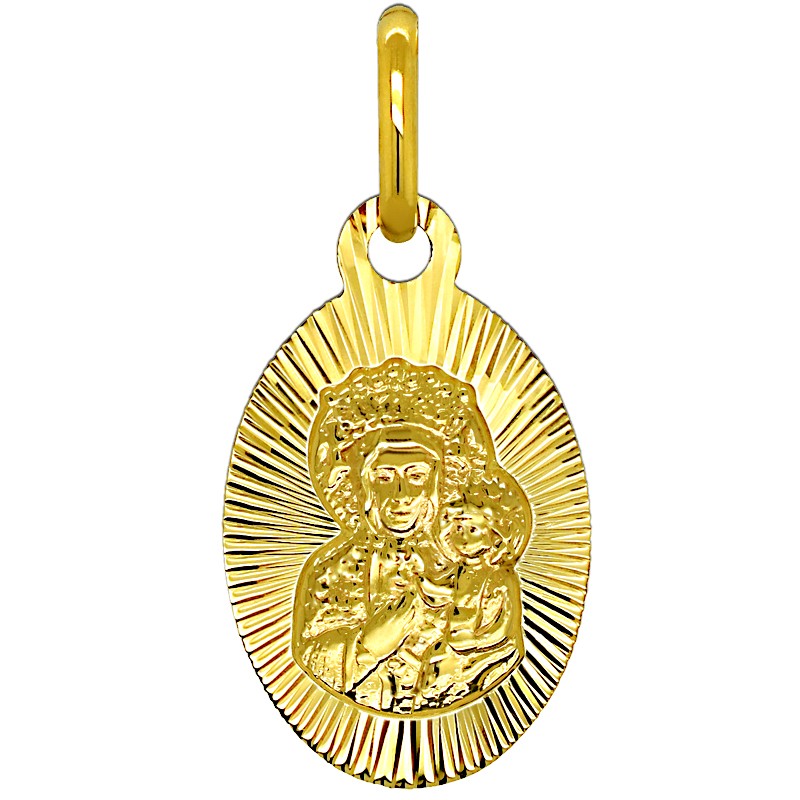 Złoty medalik – z wizerunkiem Matki Bożej Częstochowskiej na awersie, rewers stanowi wypolerowany na gładko owalny kształt doskonałe miejsce na ewentualną dedykcję lub inny grawerunek.