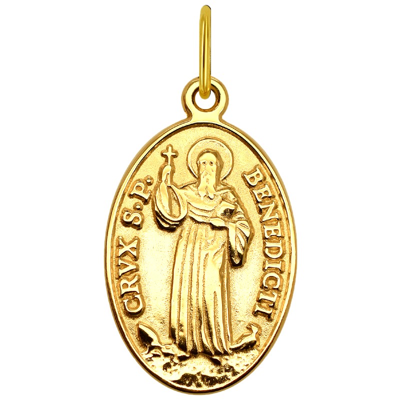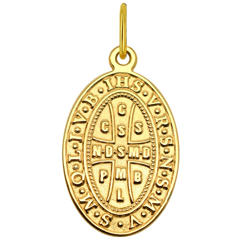 Złoty medalik Św. Benedykta Awers złotego medalika przedstawia postać św. Benedykta. Natomiast rewers przedstawia krzyż wraz z pierwszymi literami z modlitwy z egzorcyzmem, między innymi CSSML co znaczy „Krzyż święty niech mi będzie światłem”. Jest w użyciu co najmniej od XVII wieku. Ma nieść za sobą liczne łaski i błogosławieństwa, w tym oddalać duchowe i fizyczne niebezpieczeństwa.