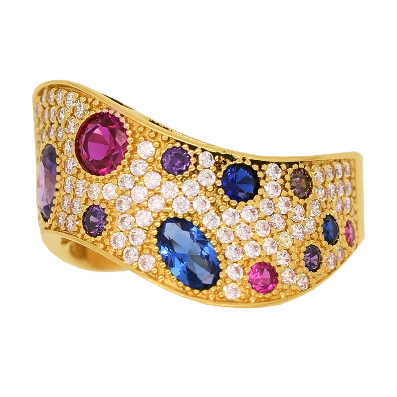 Wyjątkowy złoty pierścionek z różnokolorowymi kamieniami to wyraz żywej ekspresji kolorów i stylu. Pierścionek zdobią kamienie o różnych odcieniach, tworząc unikalny efekt i piękno. Przenieś się w świat barw i piękna z naszym złotym pierścionkiem zdobionym różnokolorowymi kamieniami. Nietuzinkowy złoty pierścionek królewski, bogato zdobiony różnokolorowymi cyrkoniami. Nieoczywisty i nieregularny kształt imitujący falę dodaje mu uroku. Artystyczne dzieło posiadające klasę i niezwykłą energię. Wyraźny i oryginalny element naszej stylizacji. Nasz produkt może powiększyć kolekcję Twojej biżuterii lub też stać się prezentem dla kogoś bliskiego. Każda okazja jest dobra, aby utrwalić ważny czas w małym, złotym wyrobie artystycznym.