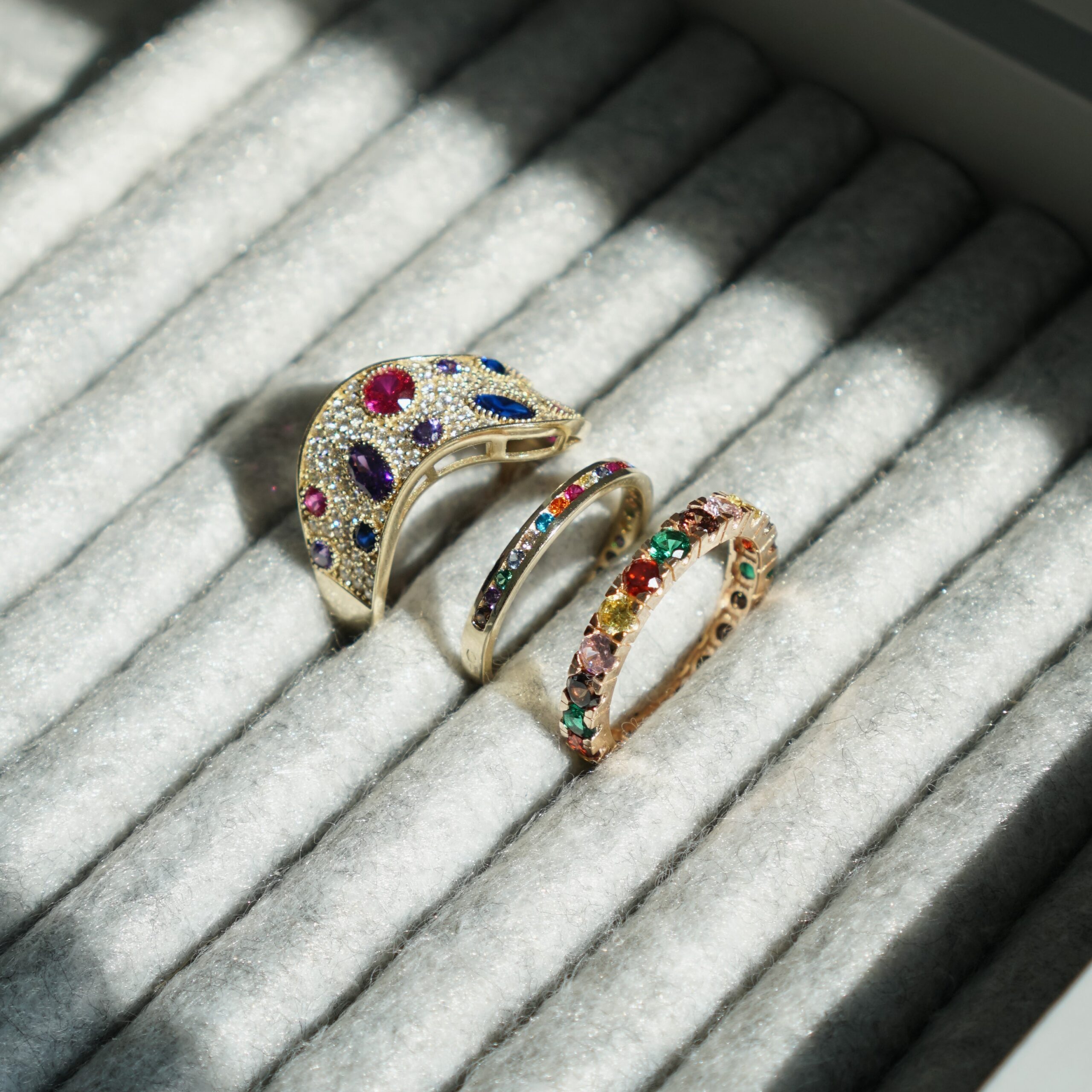 Wykonany z najwyższej jakości złota próby 585 (14K) pierścionek gwarantuje trwałość przez wiele lat noszenia. Złoty Pierścionek z różnokolorowymi kamienieniami komponuje się zarówno z codziennymi jak i eleganckimi, a także szalonymi stylizacjami.