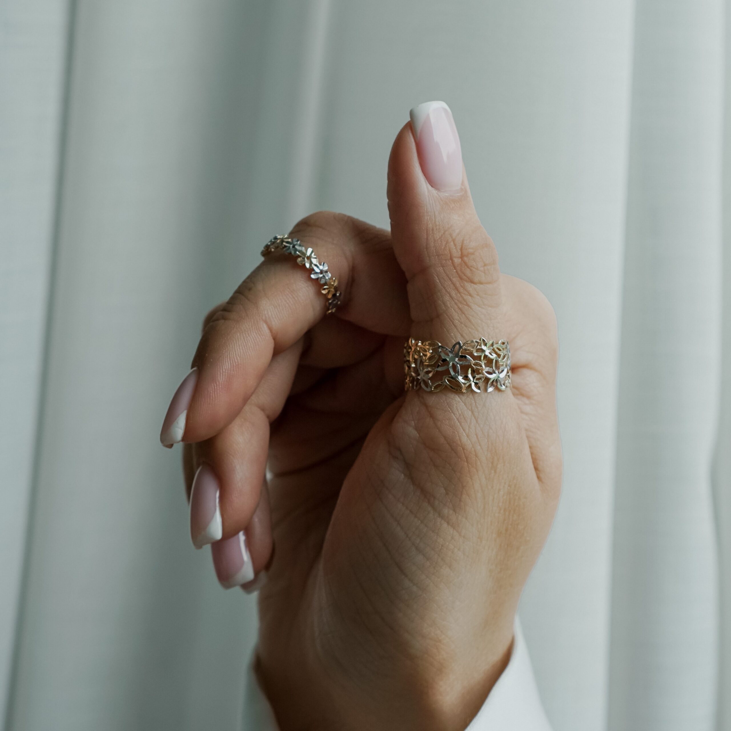 Starannie zapakowany złoty pierścionek wzór kwiatowy