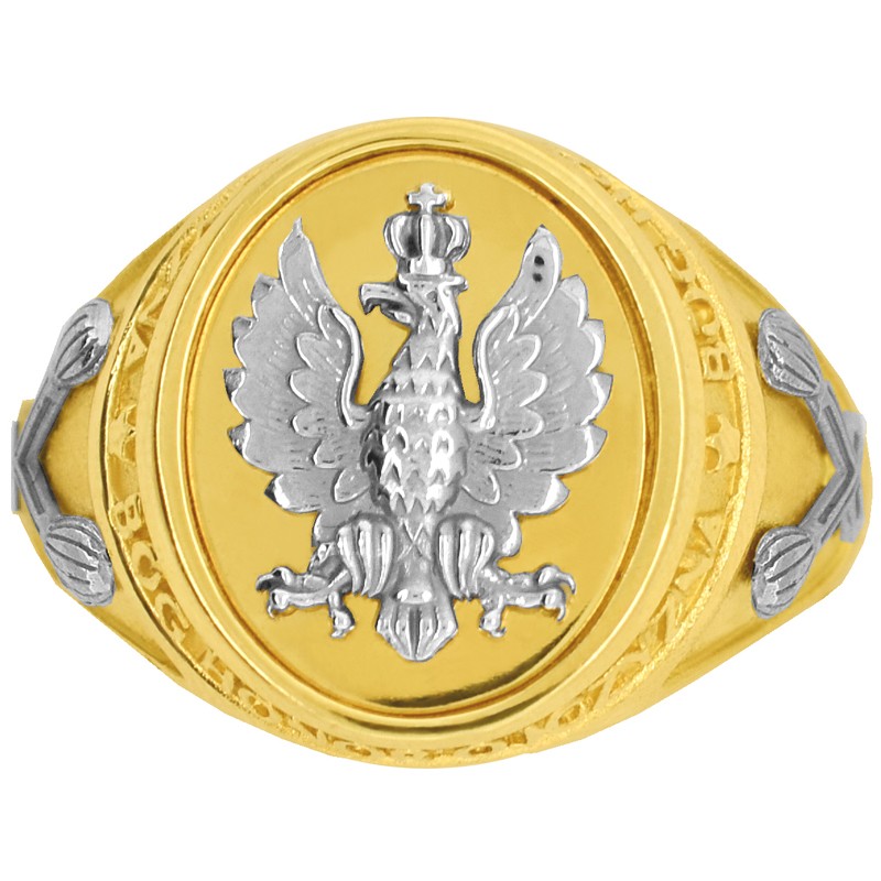 Efektowny, tradycyjny, rodowy złoty sygnet męski z wizerunkiem orła, o charakterze patriotycznym, wzbogacony napisem ” BÓG HONOR OJCZYZNA” Połączenie dwóch kolorów złota nadaje produktowi klasy i historycznego i patriotycznego charakteru.