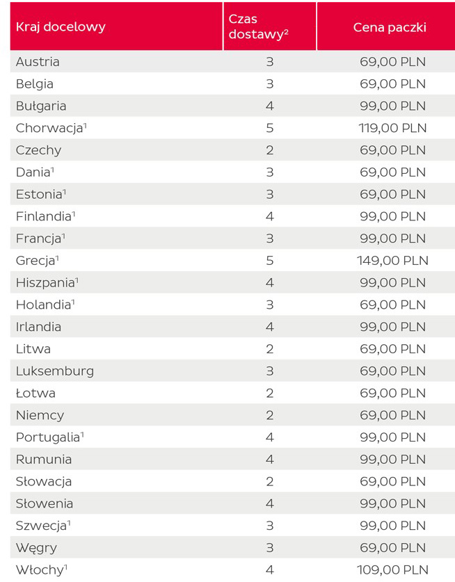 | Kurier | Koszt dostawy | Czas dostawy2 |